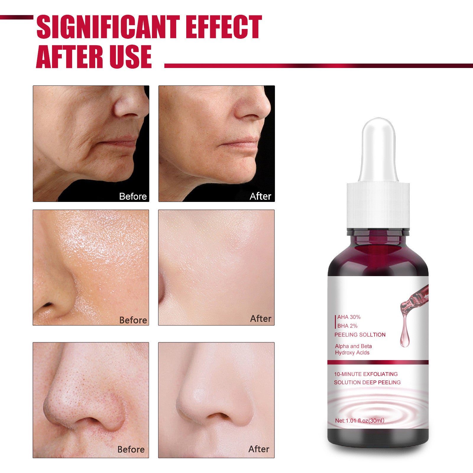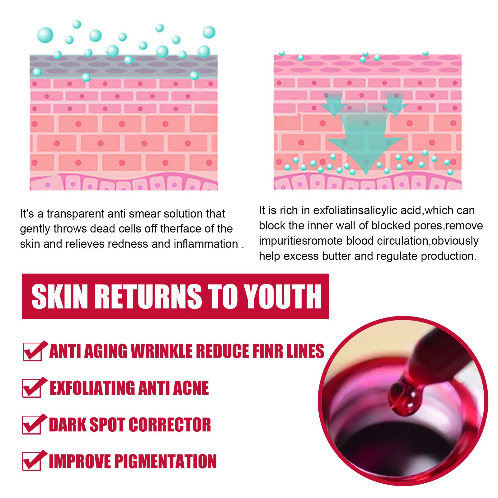 Product Size:10.5*2.7cm Ingredients: Salicylic acid serum, aloe vera extract, vitamin b5 Efficacy: exfoliation, blackheads, pore reduction Capacity:30ml
